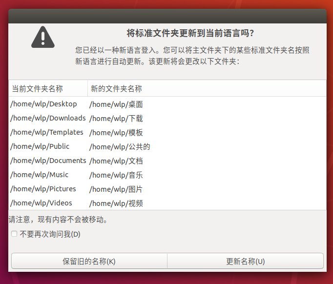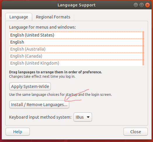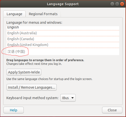 安装完成后在语言支持界面将汉语调整到最前面,如下图所示:选中汉语向上拖