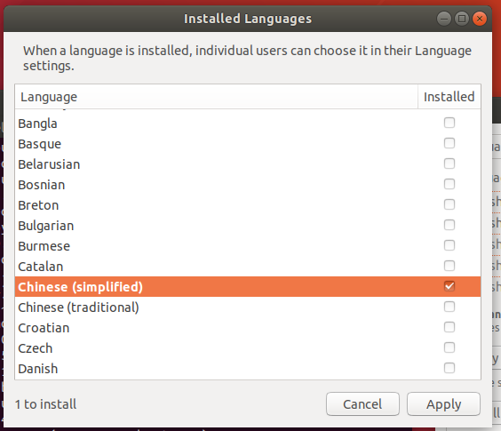 此处选择“中文简体”然后单击Apply即可。这个Apply过程会安装一系列中文语言包,如下图所示: