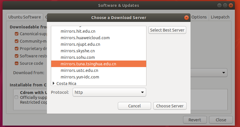 在设置找到软件与更新,全选,点击下载自,选择中国,选择清华源
